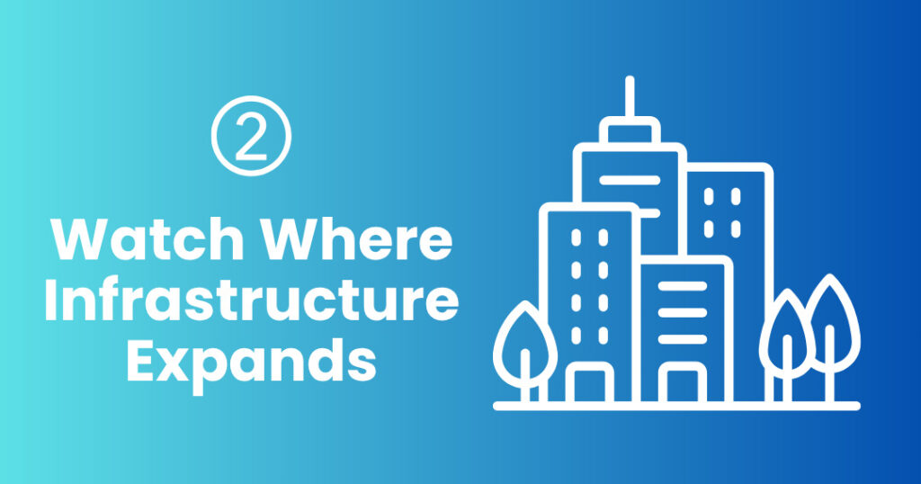 Road expansions, hospitals, and new developments create investment corridors.